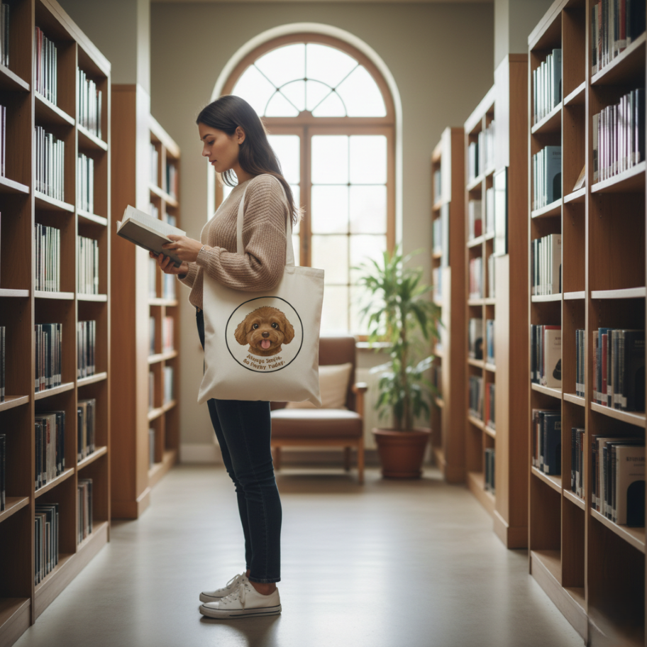 차분한 도서관 분위기와 참 잘 어울리는, 사랑스러운 푸들 일러스트가 담긴 화이트 캔버스 에코백입니다.
