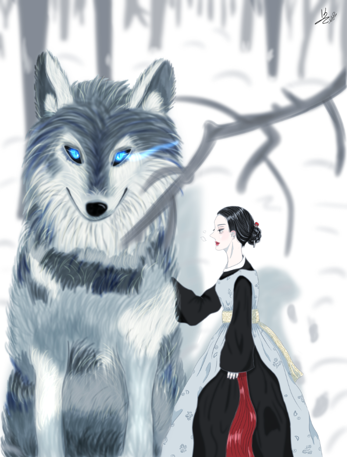 눈 쌓인 겨울 숲에서 교감하고 있는 거대 늑대와 예인(藝人)입니다.