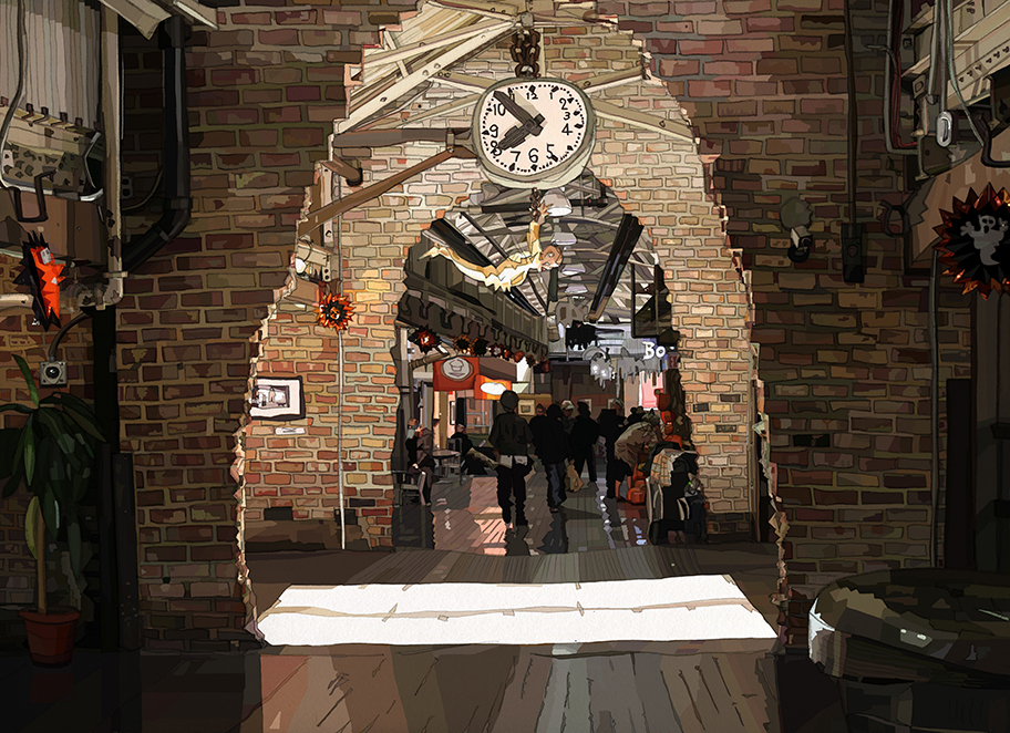빈티지 벽돌과 오래된 시계 아래로 이어지는 시장의 풍경을 따뜻하게 표현한 작품입니다.