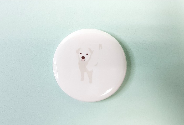 It is a 58mm diameter pin button with clothes pins on the back, allowing you to attach it to a bag or piece of clothing.