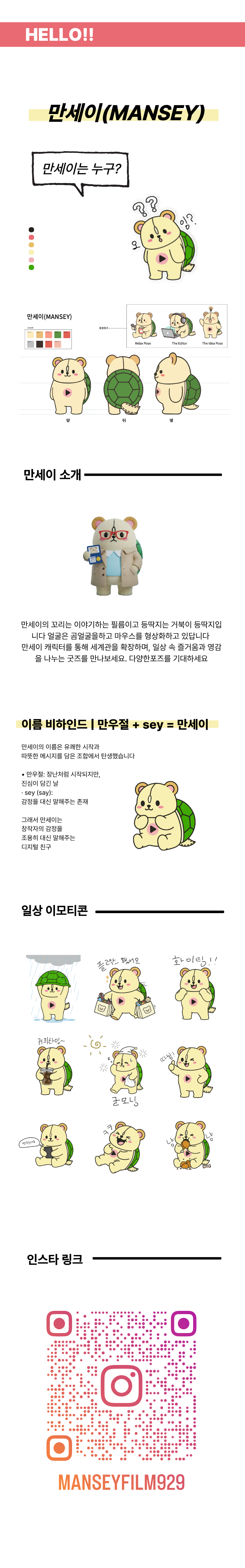 만세이는 🐻+ 🐢 + 마우스 + 플레이버튼 + 🎞 스트랩 꼬리를 가지고 있는 캐릭터입니다