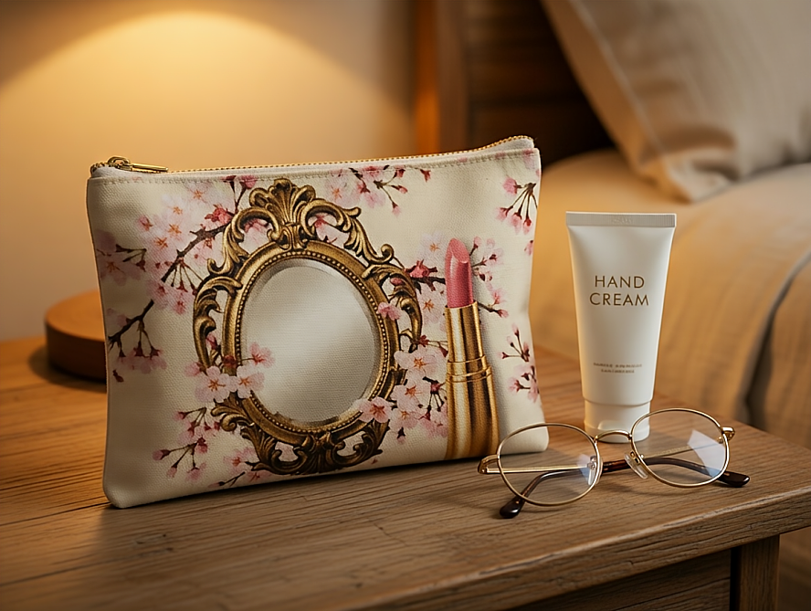 깊고 우아한 네이비 벨벳 위로 흩날리는 벚꽃잎과 앤틱한 황금빛 거울. 파우치 전체를 감싸는 풀 프린팅(Full-printing) 디자인으로 제작되어, 가방에서 꺼내는 순간 당신의 일상에 한 폭의 명화를 선물합니다.
