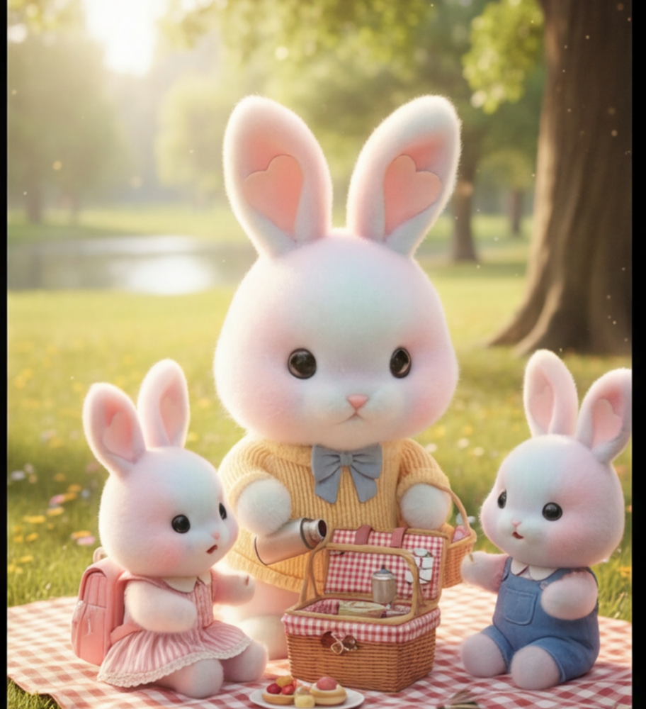 晴れた日にピクニックに出かけた、うさぎ家族の穏やかなひとときを詰め込みました。