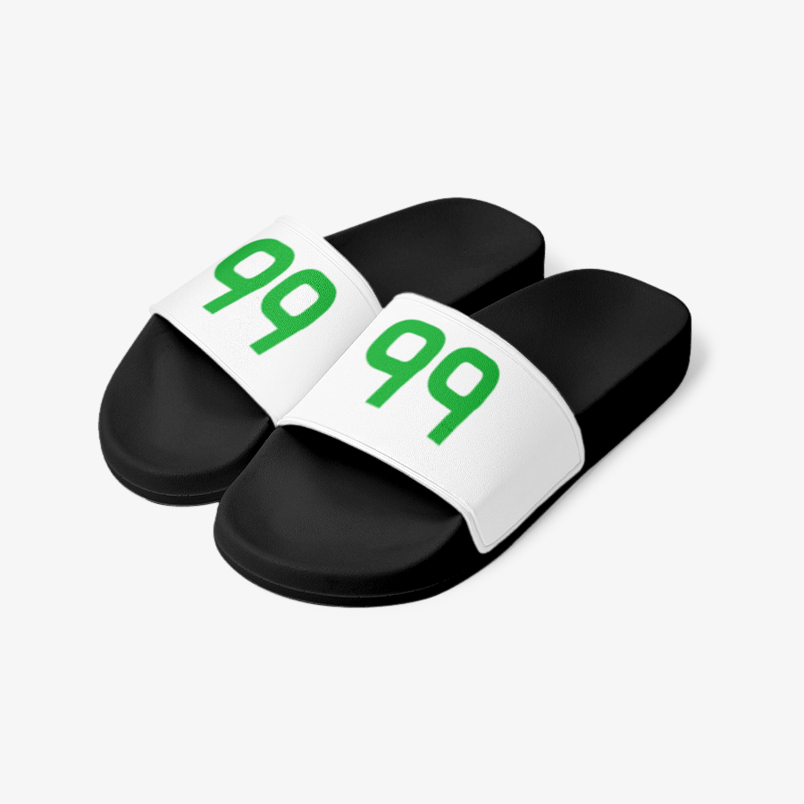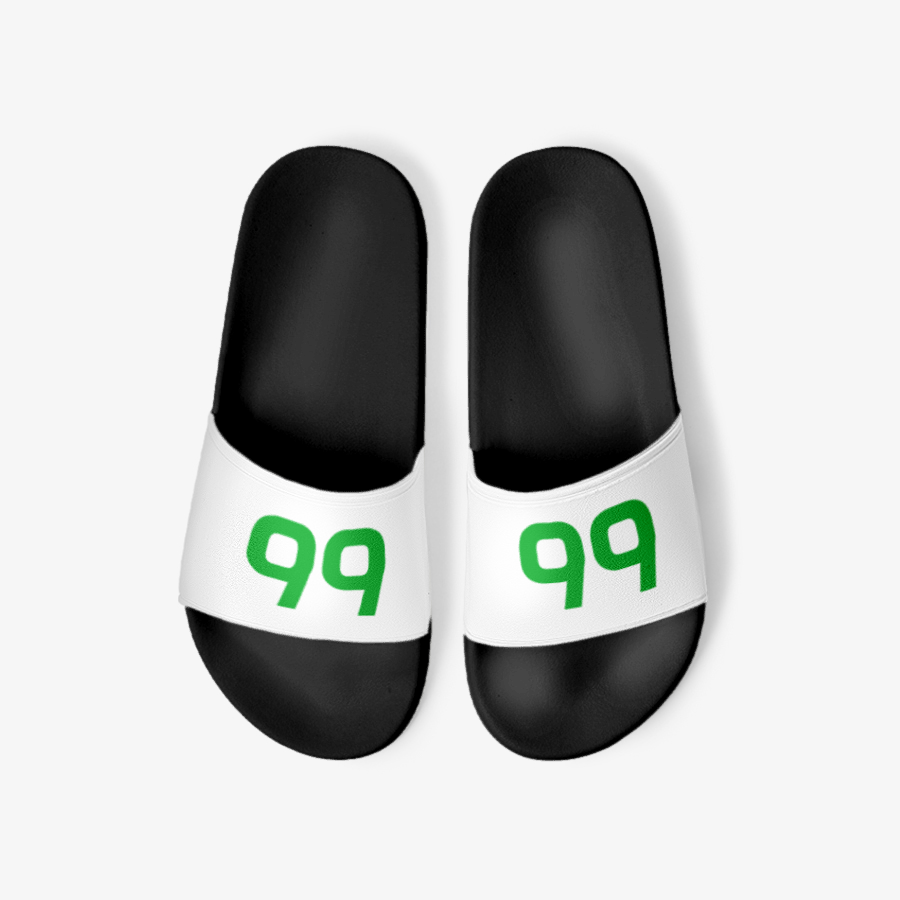 유튜버 99bro의 상징인 그린 99 로고가 돋보이는 심플한 디자인의 슬리퍼입니다.