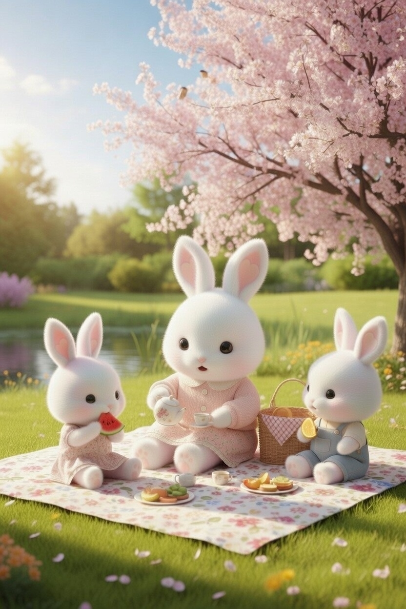 따뜻한 햇살 아래 소풍을 즐기는 토끼 가족의 모습을 담았습니다.