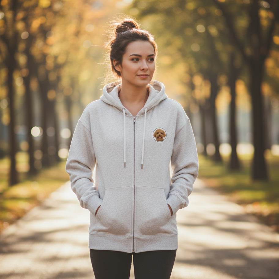 동글동글하고 폭신해 보이는 푸들의 얼굴을 원형 로고 안에 담아, 일상적인 후드 집업에 귀여운 포인트를 더했습니다.