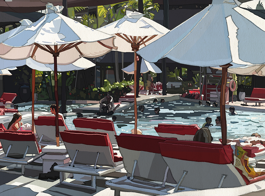 선명한 레드 & 화이트 컬러 포인트가 돋보이는 모던한 수영장 일러스트입니다.