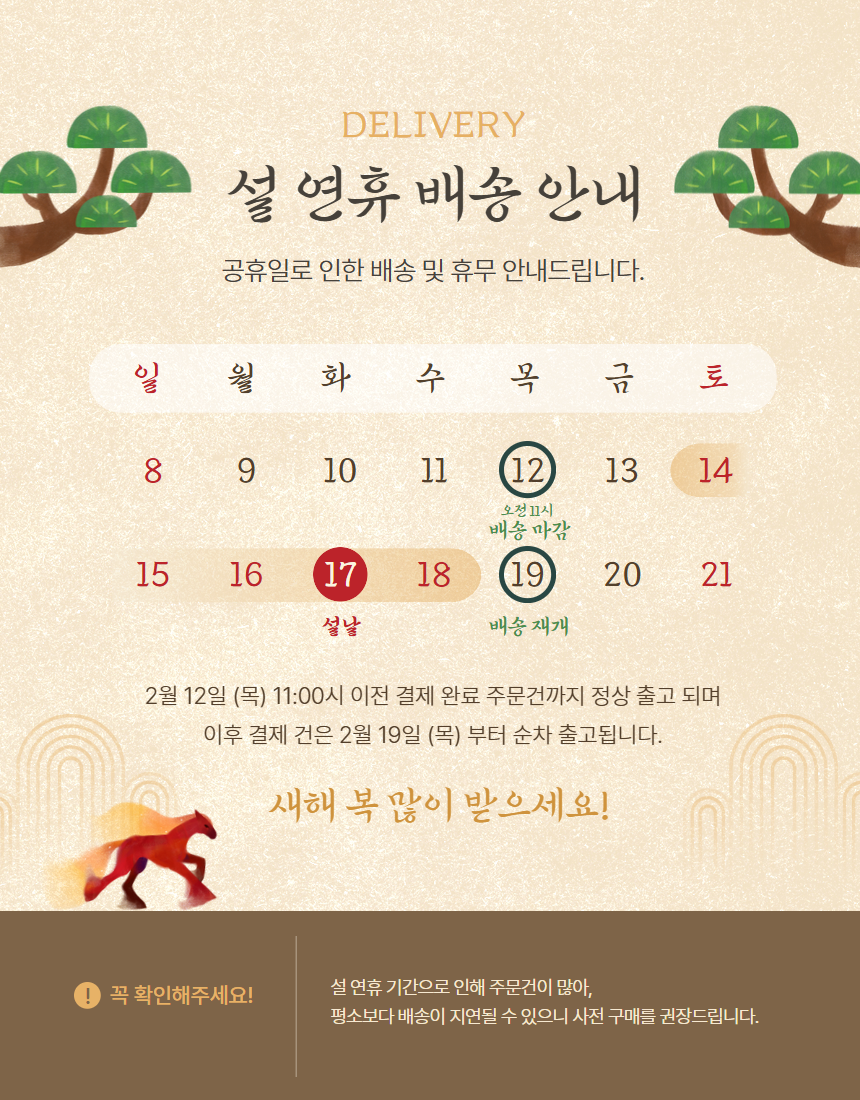 - 설연휴 택배 운영 : 2월 13(목) 오전 11시 배송 마감, 2월 19일(목) 배송 재개