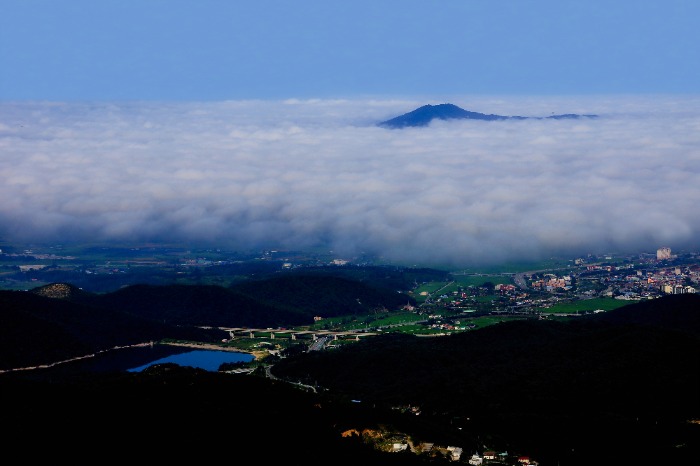 산위에서 구름 스나미를 봅니다.