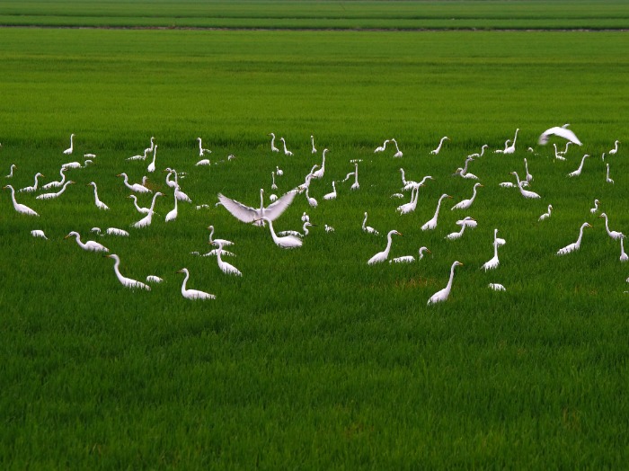 벼가 자라고 있는 논에서 백로가 먹이를 찾고 있습니다.
