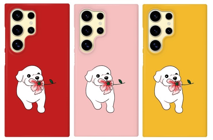 꽃을 물고다니는 귀여운 강아지 일러스트가 그려져 있는 케이스 입니다.