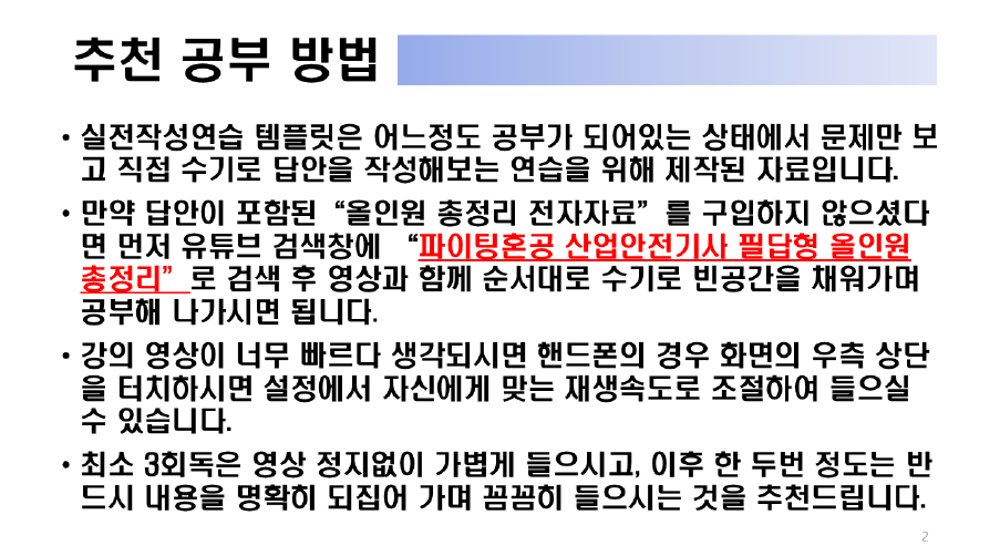 필요하신 분들께서는 매우 유용하게 사용하시리라 확신합니다. (인간공학 및 위험성평가 부분은 제외)